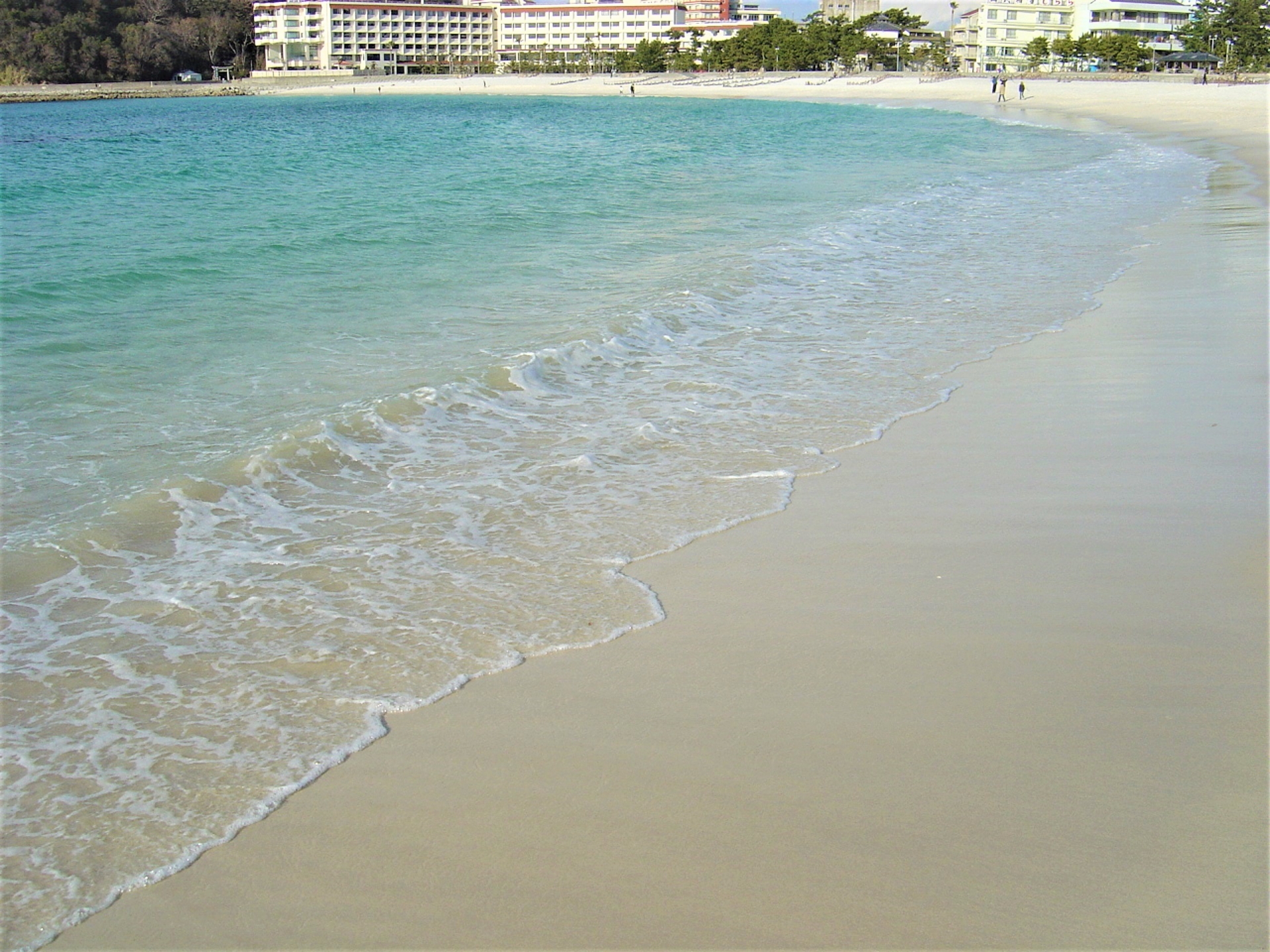 白浜という名前の通り、白くきめ細やかな砂浜が広がる白良浜は、まるで海外のリゾートのような景観を楽しめるスポットです。透き通る海と白砂のコントラストは、訪れた瞬間に非日常の空間へと引き込んでくれます。特に夕暮れ時には、空と海がオレンジ色に染まり、思わず足を止めて見入ってしまうほどの美しさです。